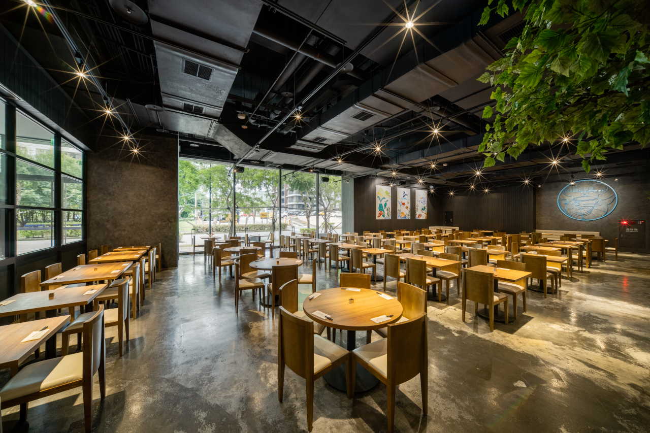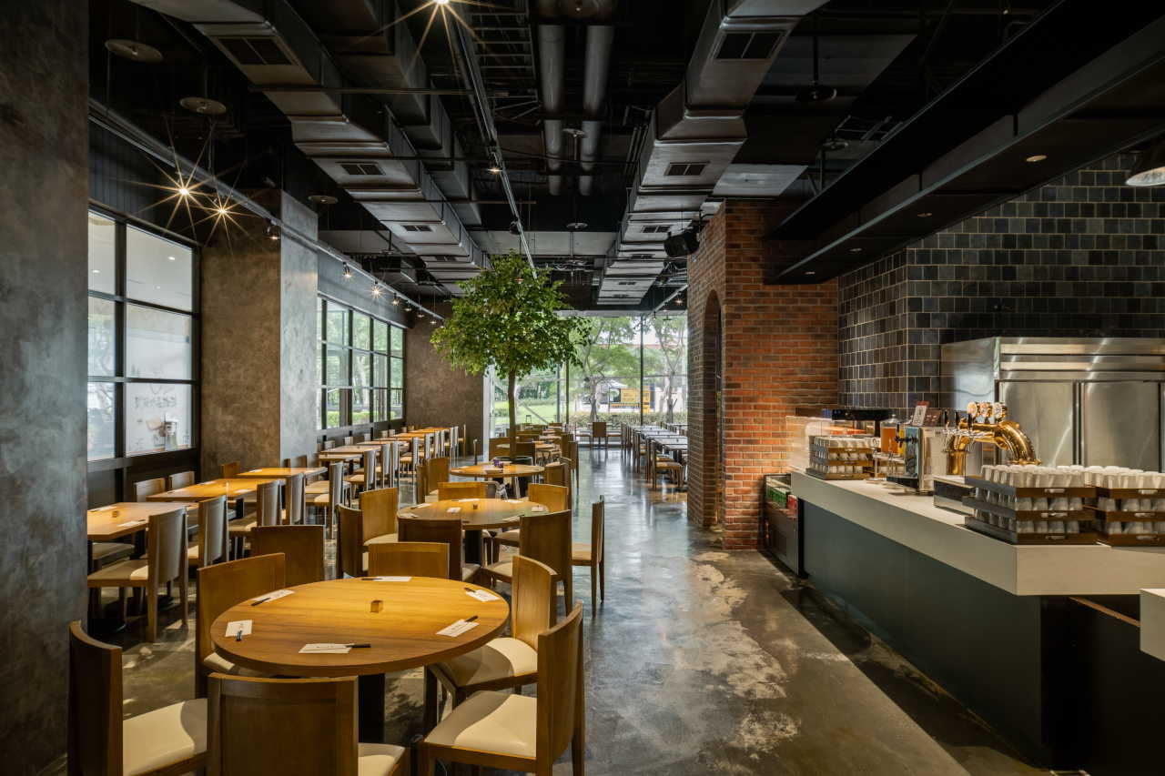 開放式中廚與點心廚房區、飲品沙拉吧台與座位用餐區,統一以磚牆、特殊漆與瓷磚串連,並巧妙引入室內盆栽,與窗外人行道的綠意相互呼應。室內與室外的界線在此漸趨模糊,色彩與光影交織出一種自然流動的節奏。