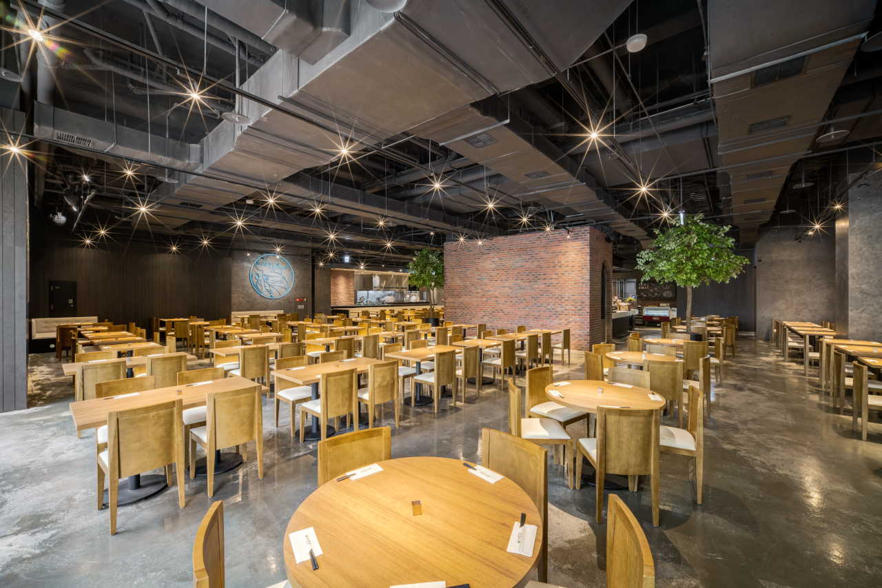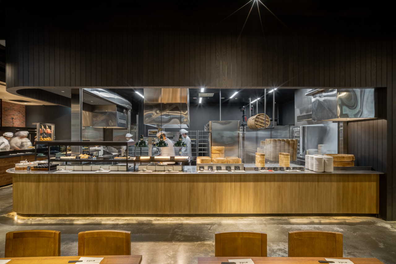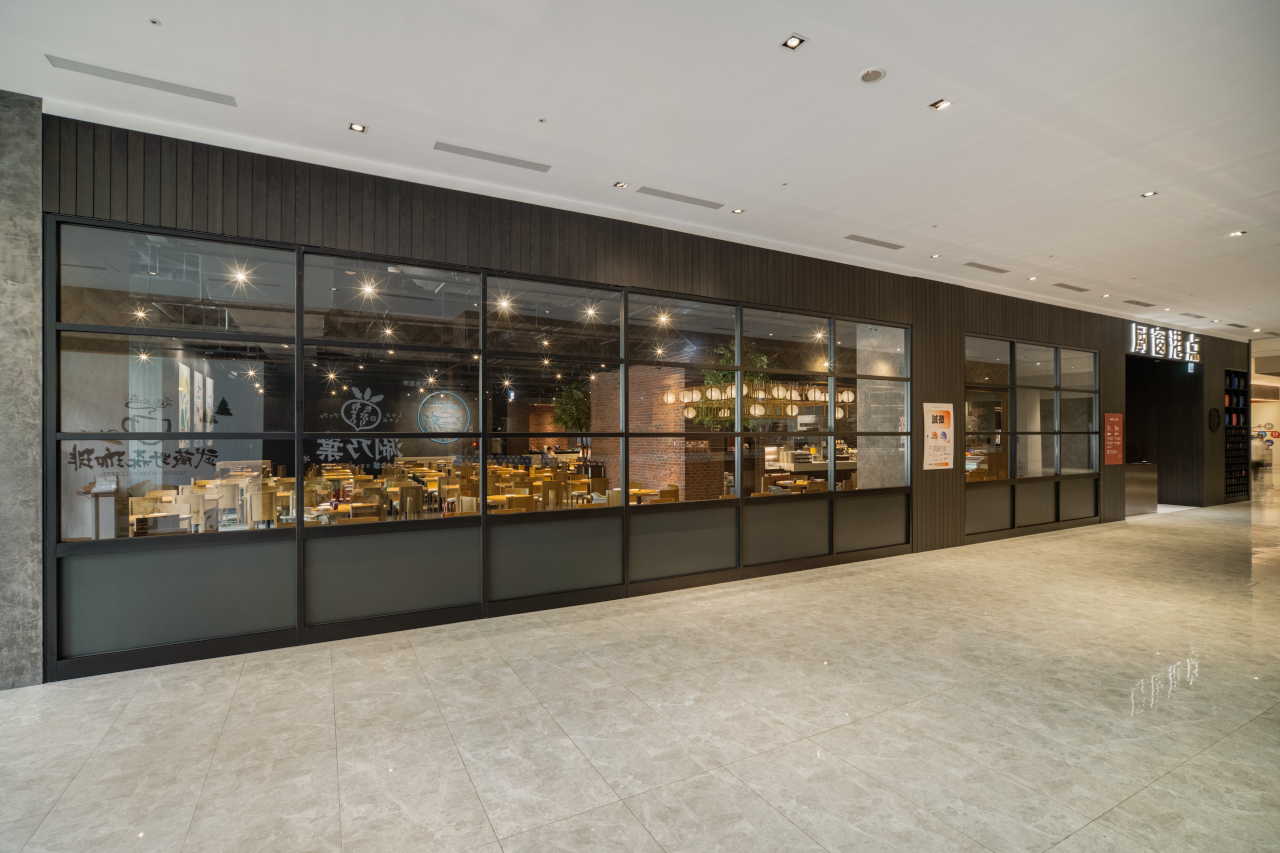 本案位於車水馬龍的都會辦公商場之中,一隅緊鄰行道樹的清透窗景,從街道便能望見餐廳裡熱鬧滾滾的人氣、蒸籠出爐的白色蒸氣,以及大火快炒映照出的光影節奏。
