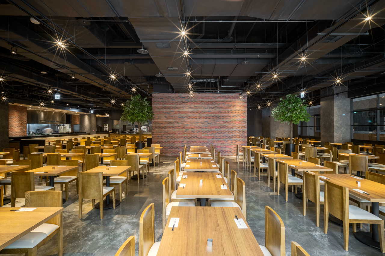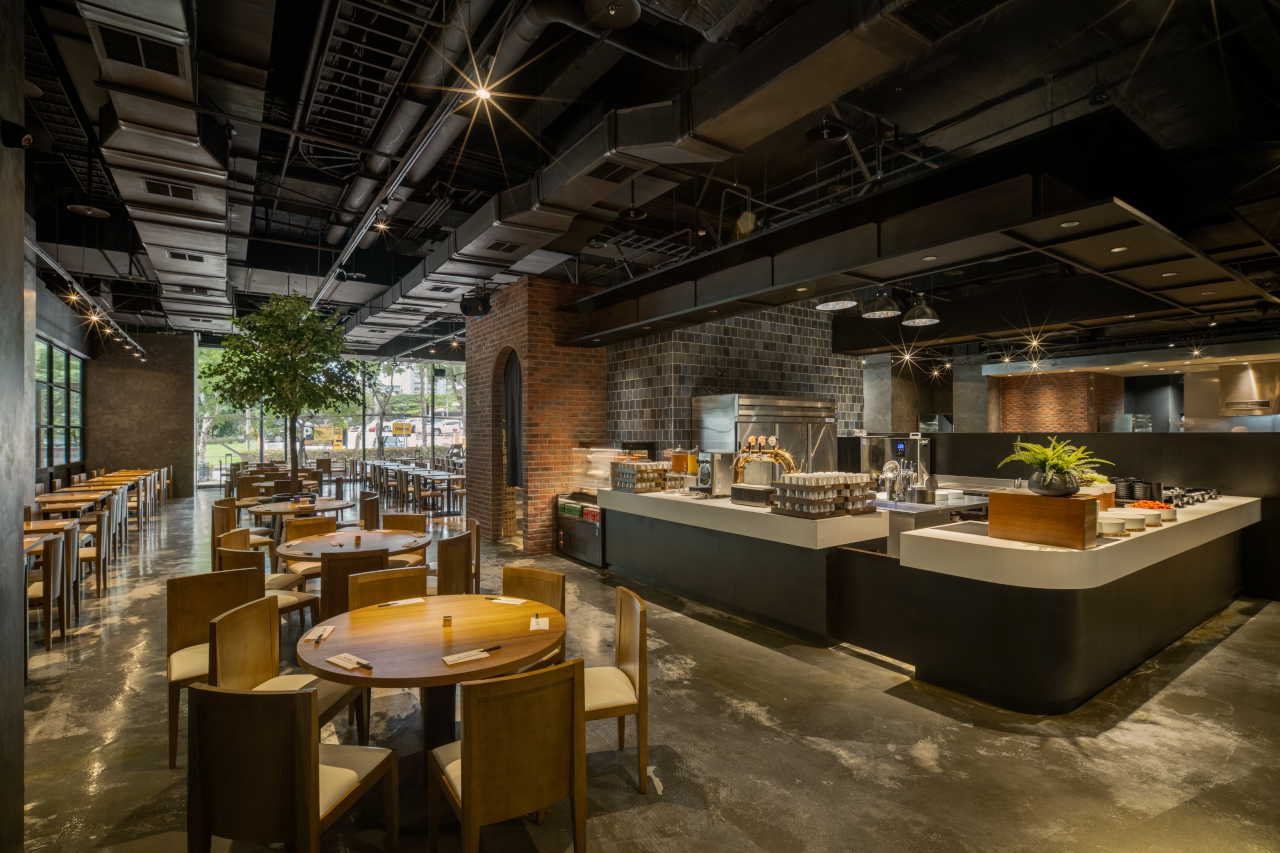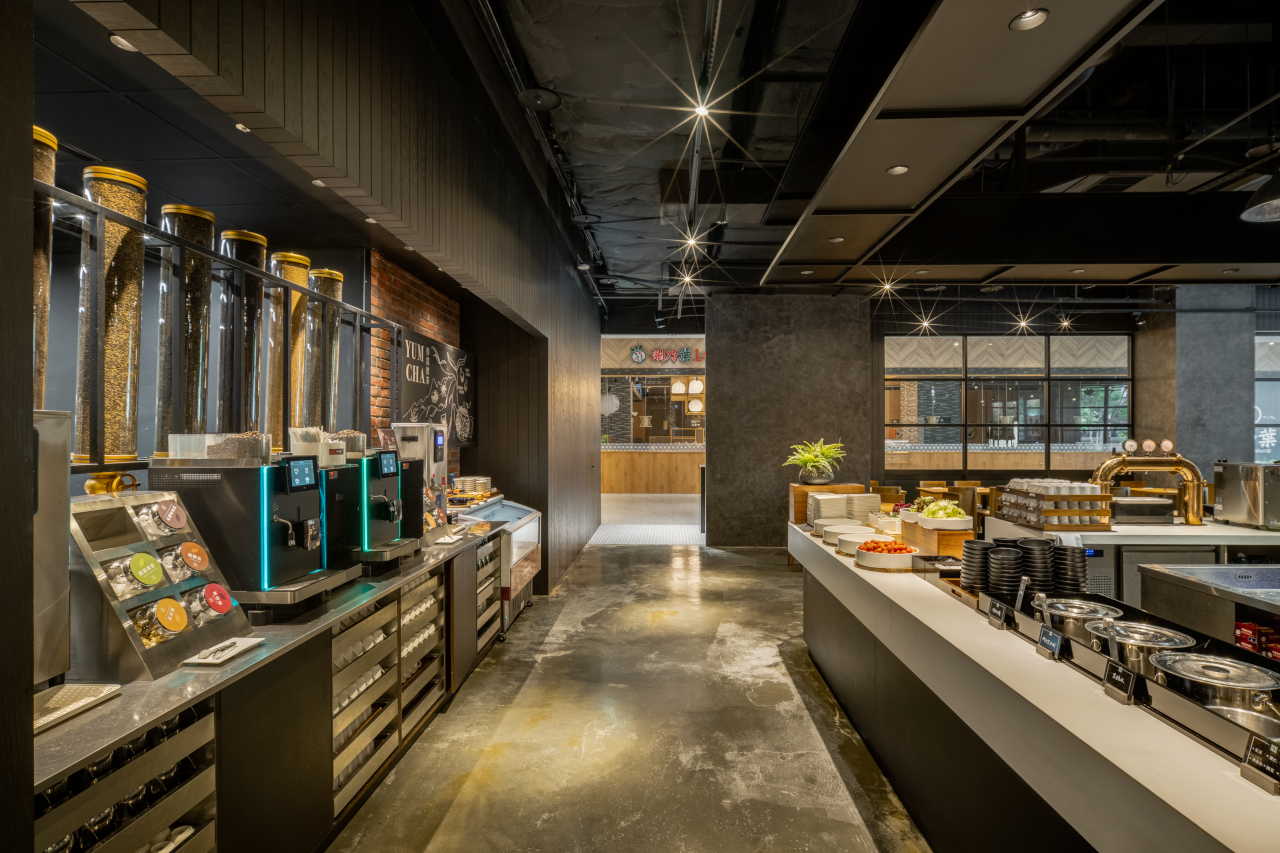 進入用餐區後,整排開放式廚房與百匯取餐區,以不同材質與形式清楚區分各式餐點動線,卻仍保有整體一致的節奏感。另一側座位區則以固定沙發座與活動桌椅錯落配置,營造富有層次的用餐景深。